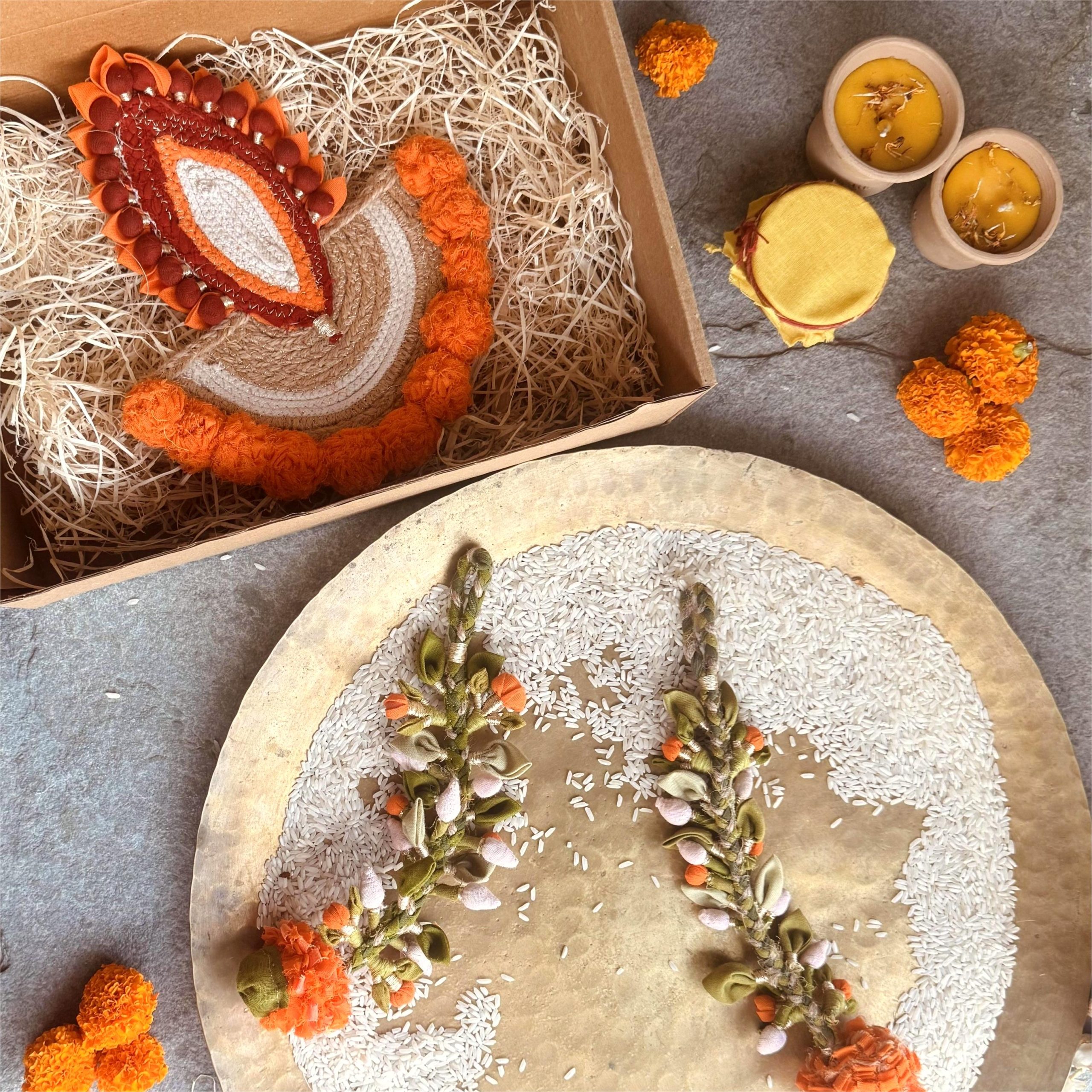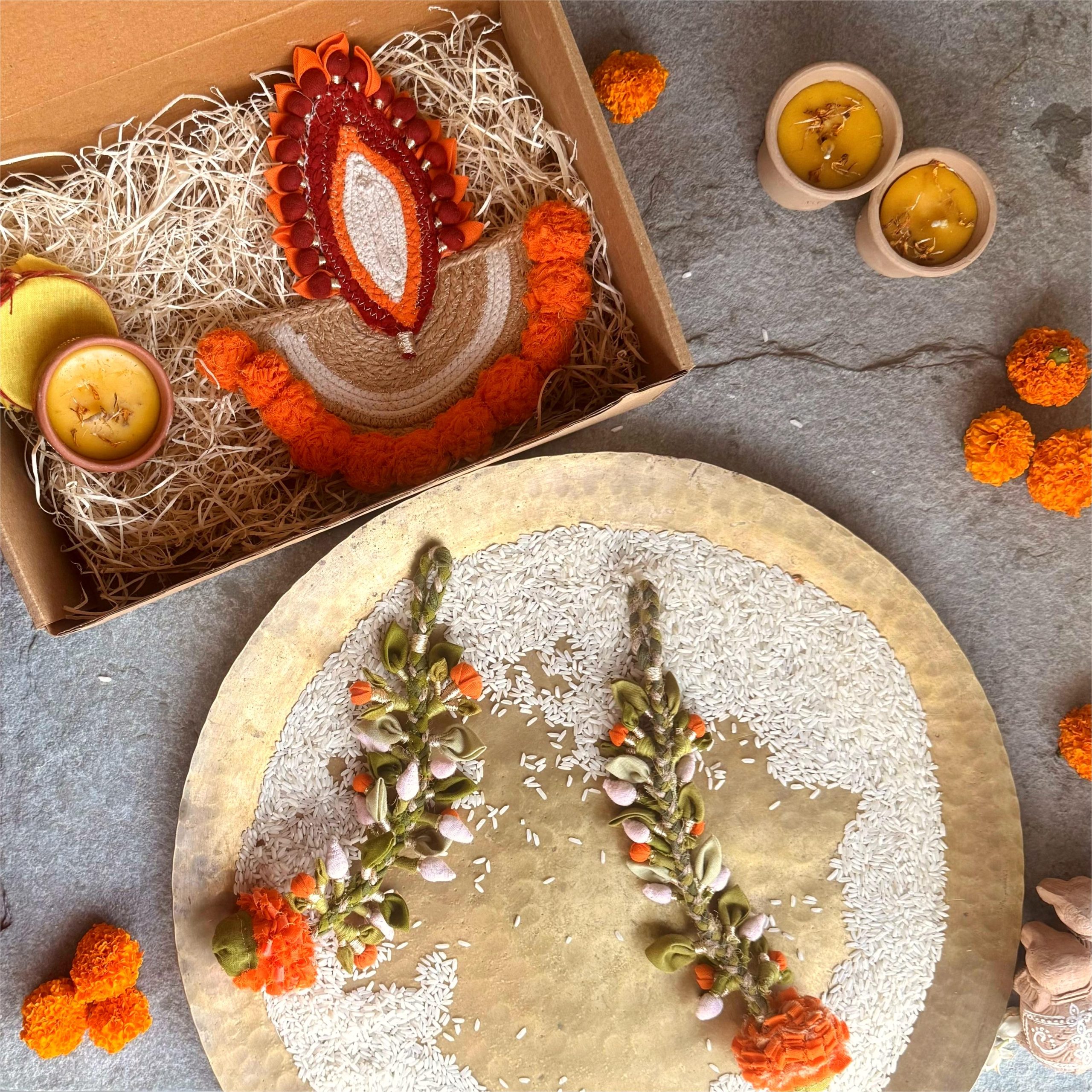 Diwali Gift Box 17 – includes a handcrafted Genda Diya Mat, 2 handpainted Gheebatti brass candles, and a set of 2 Genda Kali Torans. A sustainable festive gift by The Terra Co.