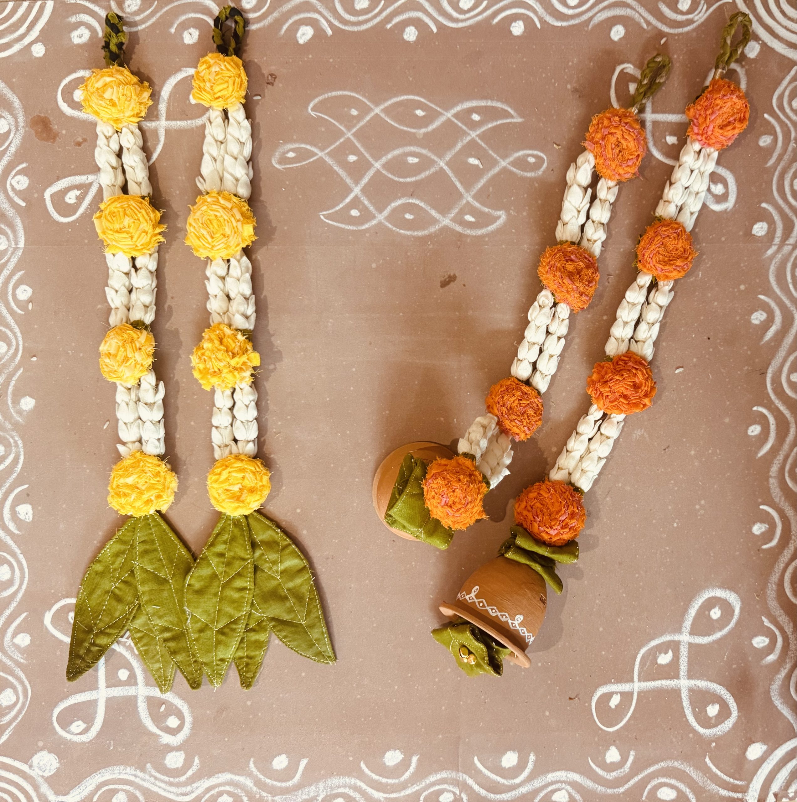 Delving into the symbolism of Toran, these hangings are more than decor—they welcome prosperity, love, and positivity into every Home. A Toran is more than decor it symbolises prosperity, love, and positivity. Traditionally made with mango leaves and marigolds, we’ve reimagined it with recycled textile waste, handcrafted into vibrant flowers and leaves. This craft reflects our grassroot tradition, where every creation carries emotion and meaning.