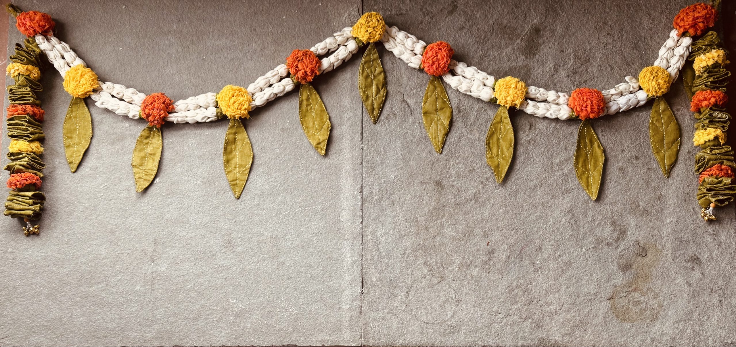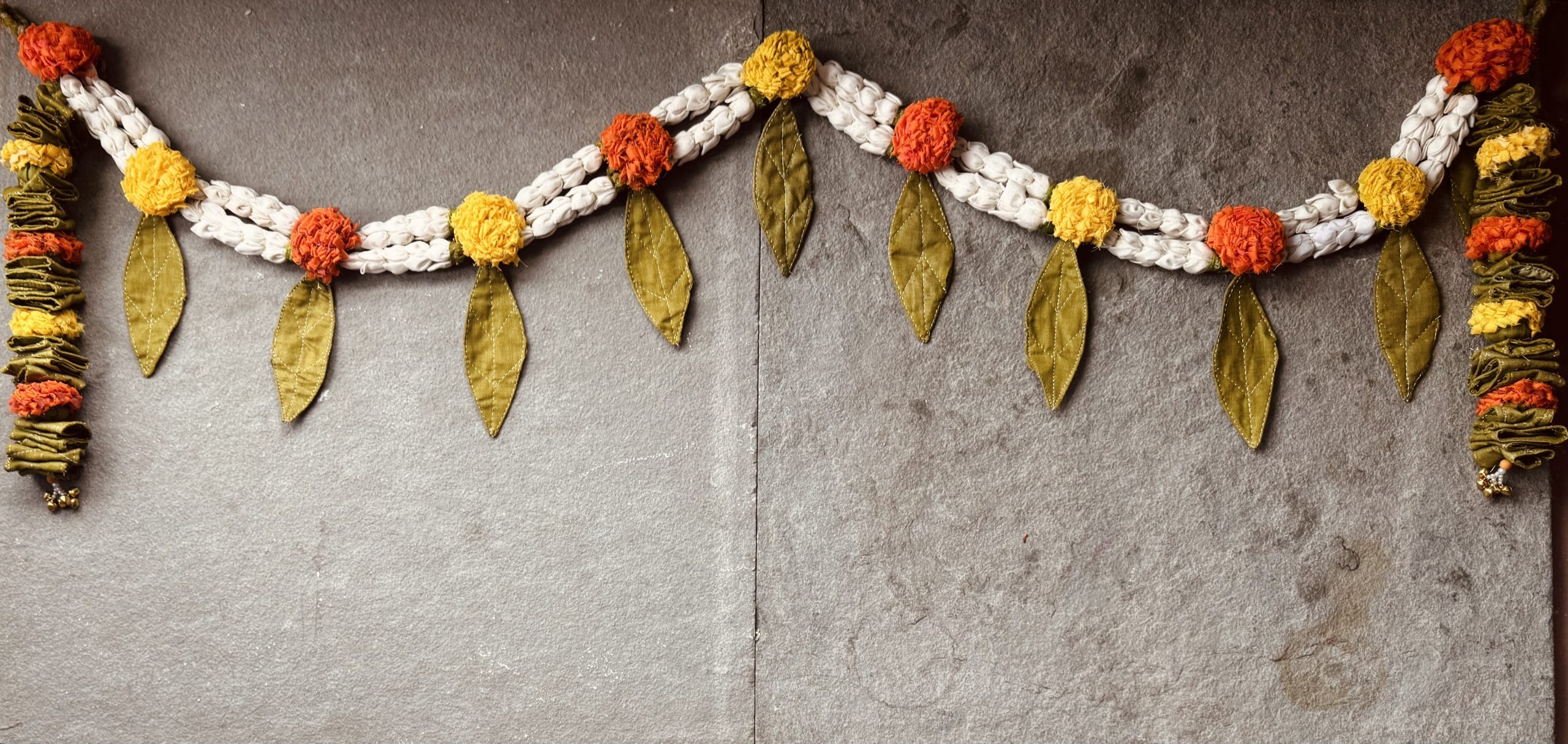 Delving into the symbolism of Bandhanwar, these hangings are more than decor—they welcome prosperity, love, and positivity into every Home. A Bandhanwar is more than decor it symbolises prosperity, love, and positivity. Traditionally made with mango leaves and marigold, Mogra Phool we’ve reimagined it with recycled textile waste, handcrafted into vibrant flowers and leaves. This craft reflects our grassroot tradition, where every creation carries emotion and meaning.