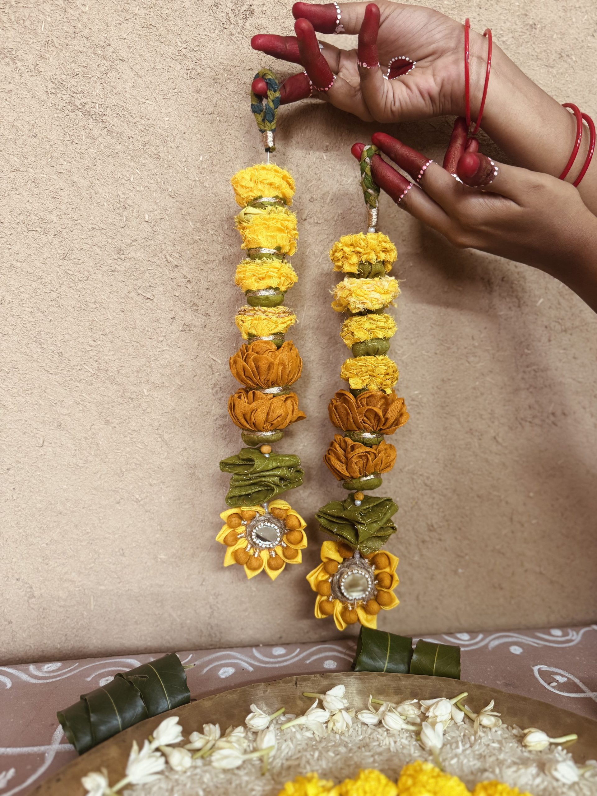 A Toran is more than decor it symbolises prosperity, love, and positivity. Traditionally made with mango leaves and marigold, Mogra Phool we’ve reimagined it with recycled textile waste, handcrafted into vibrant flowers and leaves. This craft reflects our grassroot tradition, where every creation carries emotion and meaning.